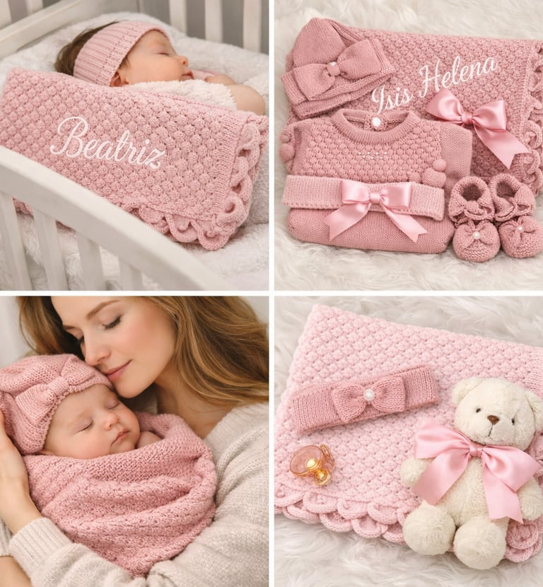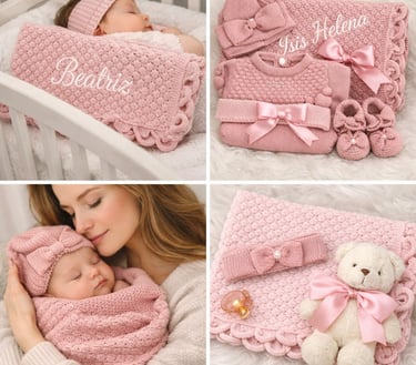 Nossa linha é feita em tricô legítimo, com textura macia e refinada, ideal para momentos como maternidade, ensaio newborn e para presentear com carinho.